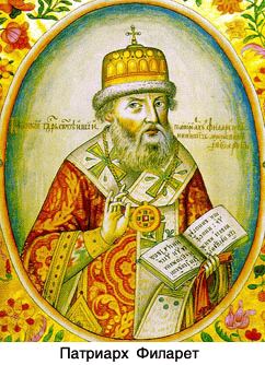 Филарет - русский церковный и государственный деятель, патриарх Московсйи и всея Руси (с 1619 г.). В миру Феодор, старший сын боярина Никиты Романовича. Предполагают, что он родился от второго брака Никиты Романовича, между 1554 и 1560 г. В детстве он получил хорошее образование и научился даже латинскому языку по собранию латинских речений, написанных для него славянскими буквами одним англичанином. Двоюродный дядя царя Феодора, любознательный и начитанный, веселый и приветливый, красивый и ловкий, соединявший любовь к книгам с любовью к развлечениям и нарядам, он играл в молодости видную роль, пользуясь одинаковой популярностью и у соотечественников, и у иностранцев. Он женился на дочери бедного костромского дворянина Ксении Ивановне Шестовой и имел от нее 5 сыновей и одну дочь. Из всех детей его пережил только сын Михаил, избранный на царство. В 1586 г. Феод. Ник. упоминается как боярин и наместник нижегородский, в 1590 г. участвует в качестве дворового воеводы в походе на Швецию, в 1593 - 94 г. состоит наместником псковским и ведет переговоры с послом имп. Рудольфа, Варкочем. В 1596 г. состоит воеводой в правой руке. По смерти царя Феодора народная молва называла его ближайшим законным преемником престола; в Москве ходили слухи, что покойный царь перед смертью прямо назначил его своим преемником. Как бы то ни было, он подписался под избирательной грамотой Бориса Годунова. В 1601 г., во время разгрома фамилии Романовых Борисом , Феод. Ник. был пострижен в монахи под именем Ф. и сослан в Антониев Сийский монастырь; жена его, постриженная под именем Марфы, сослана в Заонежские погосты, а малолетний сын Михаил и дочь заточены на Белоозере, с теткой Настасьей Никитичной. Жизнь Ф. в монастыре была обставлена очень сурово: пристава пресекали всякие сношения его с окружающим населением и изнуряли его грубым соглядатайством и мелочными притеснениями, жалуясь в тоже время в Москву на его крутой и запальчивый нрав. С появлением в 1605 г. известий о движениях Лжедмитрия в настроении Ф. была замечена резкая перемена: он повеселел и громко стал высказывать надежду на скорый переворот в своей судьбе. 30 июня 1605 г. Лжедмитрий возвел Ф. в сан ростовского митрополита. Кажется, Ф. редко наезжал в свою митрополию, проживая с тех пор большею частью в Москве. По воцарении Василия Шуйского Ф. ездил в Углич открывать мощи Дмитрия Царевича. В 1609 г. Ростов подвергся нападению тушинцев; Ф., запершийся с народом в соборе, был схвачен и, после различных поруганий, с бесчестием отправлен в Тушино. Однако, тушинский вор, по мнимому своему родству с Ф., назначил его патриархом всея Руси. В качестве нареченного патриарха Ф. рассылал грамоты по церковным делам в области, признававшие власть тушинского вора, а после бегства вора в Калугу участвовал в переговорах тушинцев с польским королем о приглашении последнего или его сына на русский престол. Когда Рожинский, в марте 1610 г., сжег Тушино, отряд польских тушинцев, отступивший к Иосифову Волоколамскому монастырю, захватил с собою и Ф. Только по разбитии этого отряда русским войском Ф. получил свободу и отъехал в Москву. По свержении Шуйского Ф., по указанию Жолкевского, желавшего удалить из Москвы наиболее влиятельных лиц, был назначен вместе с кн. Голицыным в посольство к Сигизмунду, для заключения договора о вступлении на русский престол корол