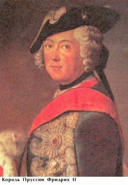 Фридрих II Великий - прусский король (1740 - 1786 гг.), добился превращения своей страны в великую европейскую державу. Проводил политику "просвещенного абсолютизма, укреплял армию. В ходе Семилетней войны (1756 - 1763 гг.) вел борьбу с Саксонией за общегерманское первенство. На стороне Саксонии выступили Австрия, Франция, Россия, Польша, Швеция. Русские войска нанесли пруссакам поражение при Гросс - Егерсдорфе (1757 г.), под Цорндорфом (1758 г.), при Кунерсдорфе (1759 г.). При Кунерсдорфе прусская армия была почти полностью разгромлена, гусарский конвой чудом уберег Фридриха II от русского плена. Шляпа Фридриха II, потерянная при бегстве, до сих пор хранится в Эрмитаже. Осенью 1760 г. русская армия вошла в Берлин. В это время умерла Елизавета Петровна, на престол вступил ее племянник Петр III, воспитывавшийся при дворе Фридриха II. Он сразу же прекратил военные действия против Пруссии и заключил с ней мир. В результате Семилетней войны Пруссия сохранила ведущее положение в германском мире. Фридрих II предложил Австрии и России планы раздела Польши. Внес большой вклад в развитие военного искусства. К концу его правления прусская армия насчитывала 195 - 200 тыс. чел. На ее содержание уходило 2/3 государственного бюджета.